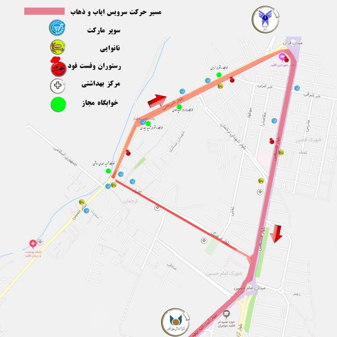 مکان خوابگاه های مورد تایید شورای نظارت و ارزیابی خوابگاه های دانشجویی، مسیر حرکت سرویس ایاب و ذهاب و مکان برخی مراکز خدماتی مورد نیاز دانشجویان بر روی این تصویر مشخص شده است.