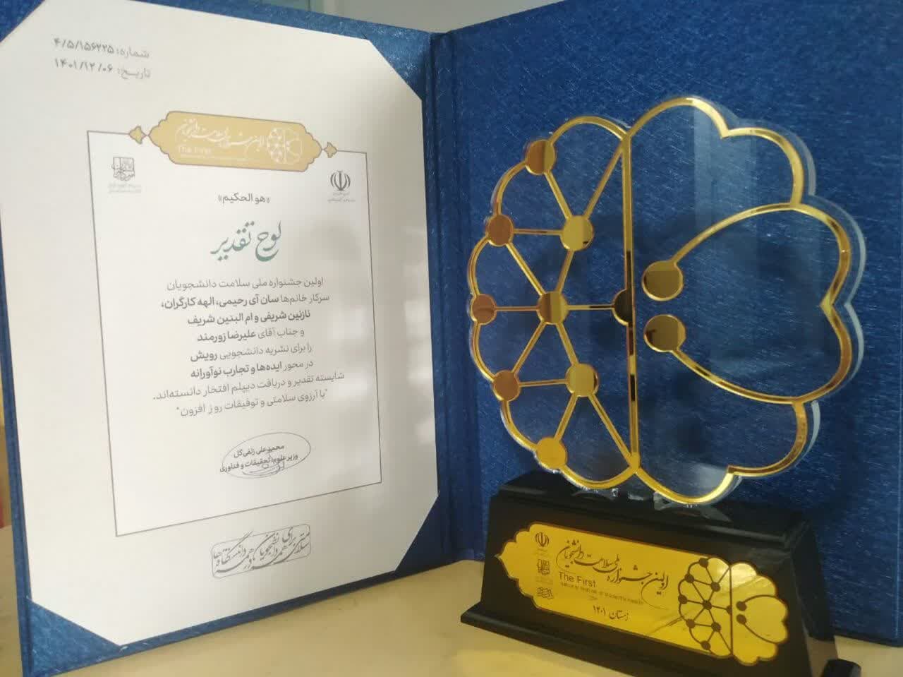 اعضای نشریه رویش در اولین جشنواره ملی سلامت دانشجویان، توسط وزیر محترم علوم تحقیقات و فناوری، تقدیر شدند.