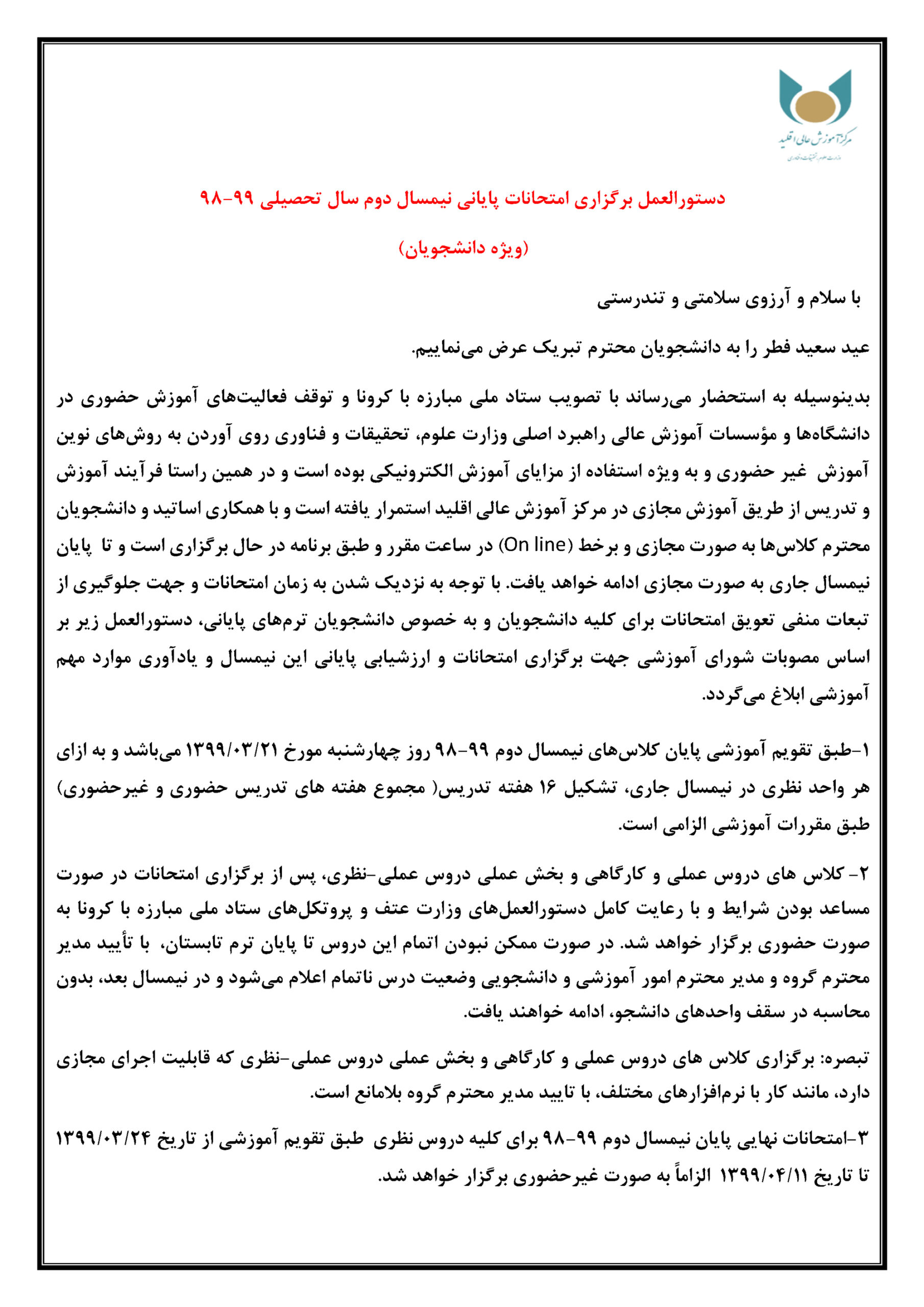 دستورالعمل برگزاری امتحانات و ارزشیابی های پایانی