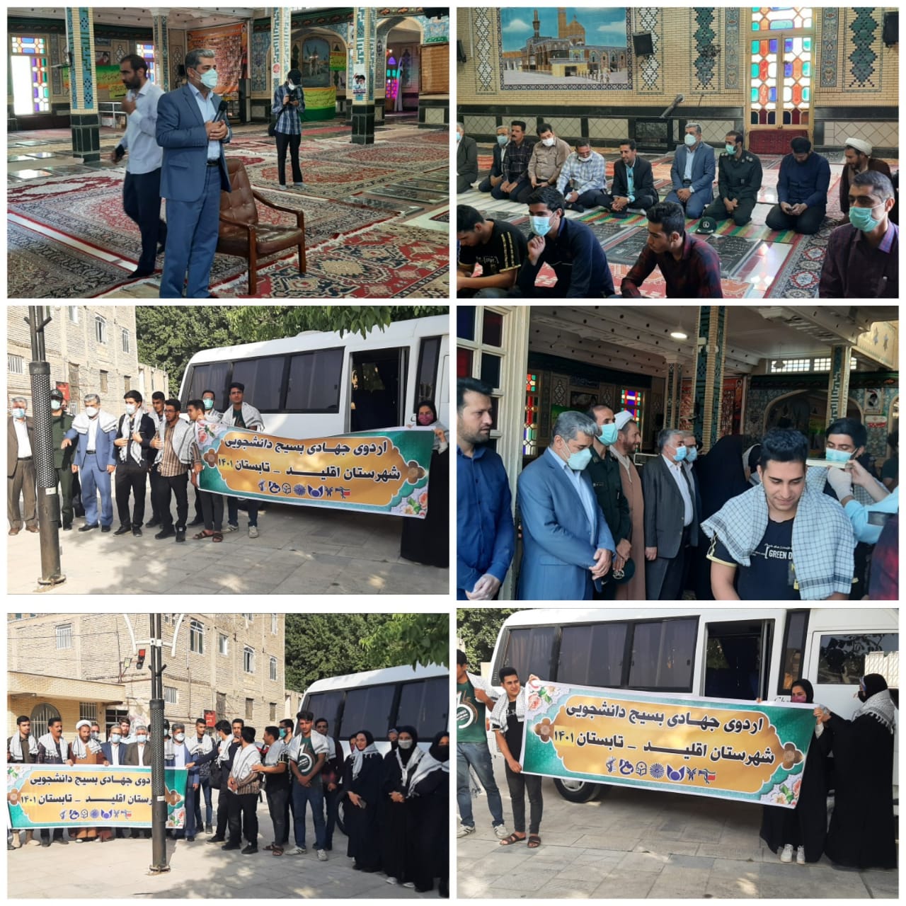 مراسم بدرقه اعزام به اردوی جهادی بسیج دانشجویی جهت انجام فعالیت عمرانی و فرهنگی روز سه شنبه مورخ ۱۴۰۱/۰۵/۰۴ در بخش حسن آباد با حضور فرماندار شهرستان ، جانشین سپاه ناحیه اقلید ، روساي دانشگاه ها و جمعی از بسیجیان در محل امامزاده عبدالرحمن شهرستان اقلید برگزار شد.