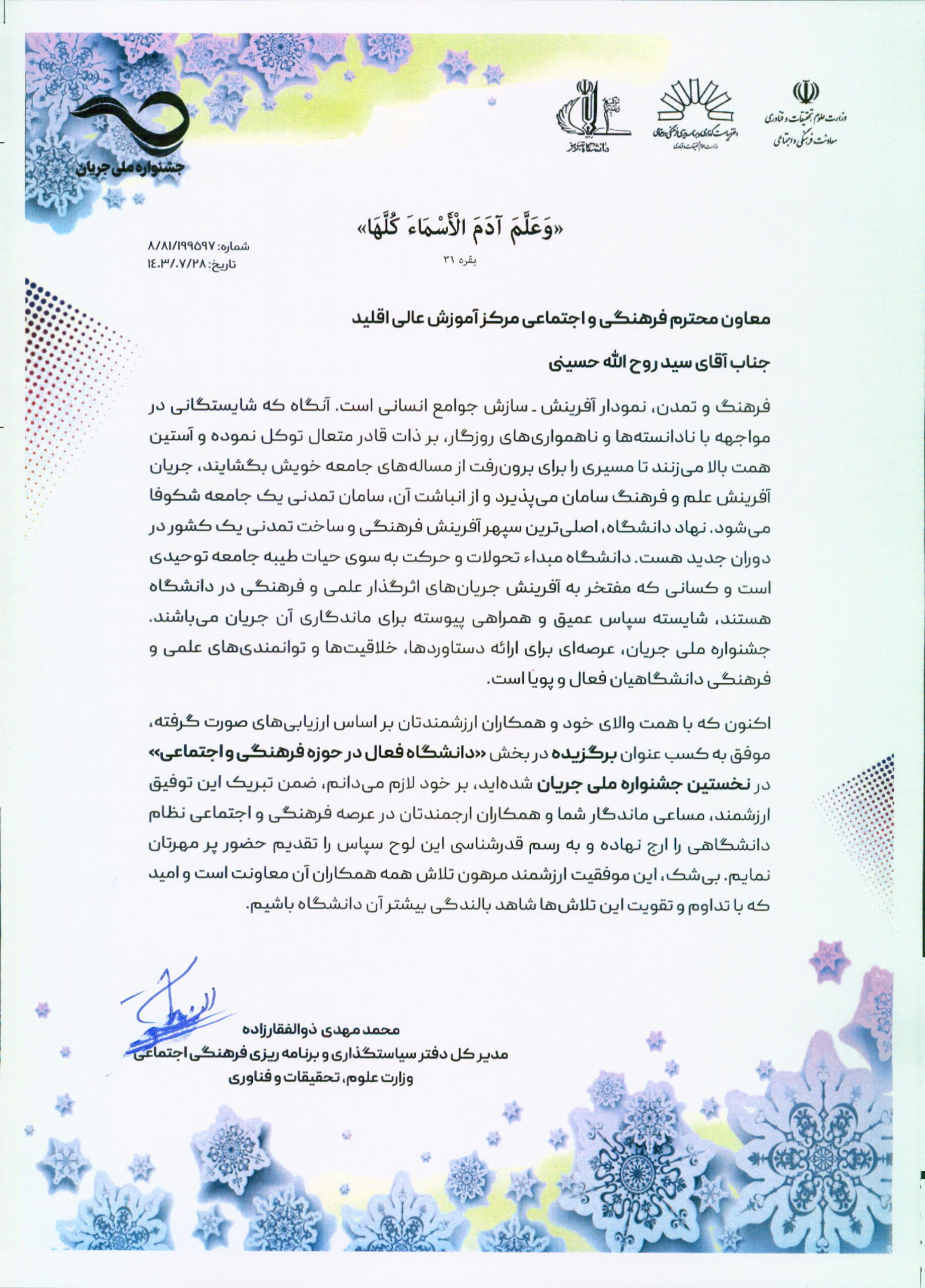 کسب عنوان «برگزیده» در بخش «دانشگاه فعال در حوزه فرهنگی و اجتماعی» توسط مرکز آموزش عالی اقلید در جشنواره ملی جریان در بین ۸۲ دانشگاه کشور