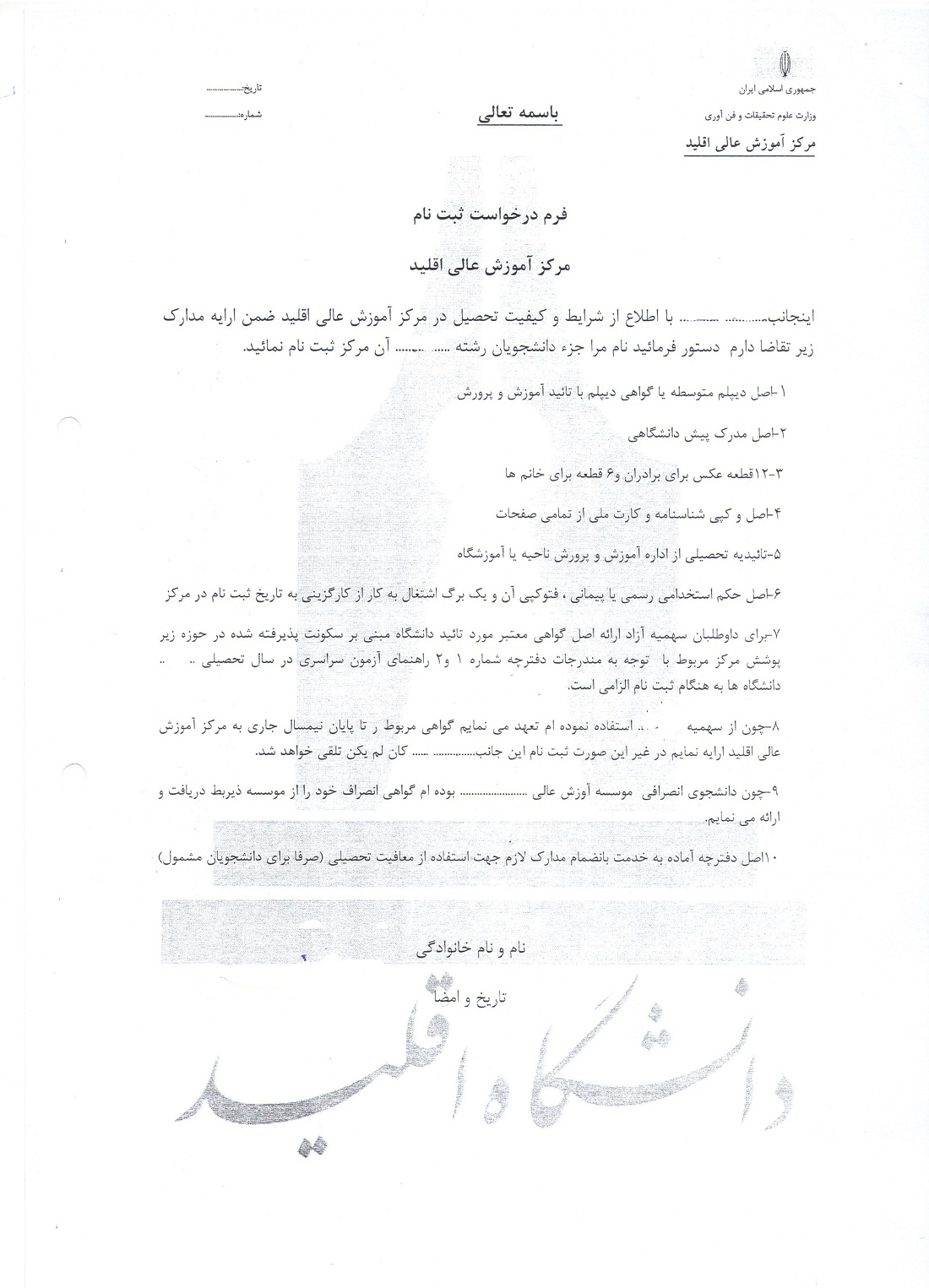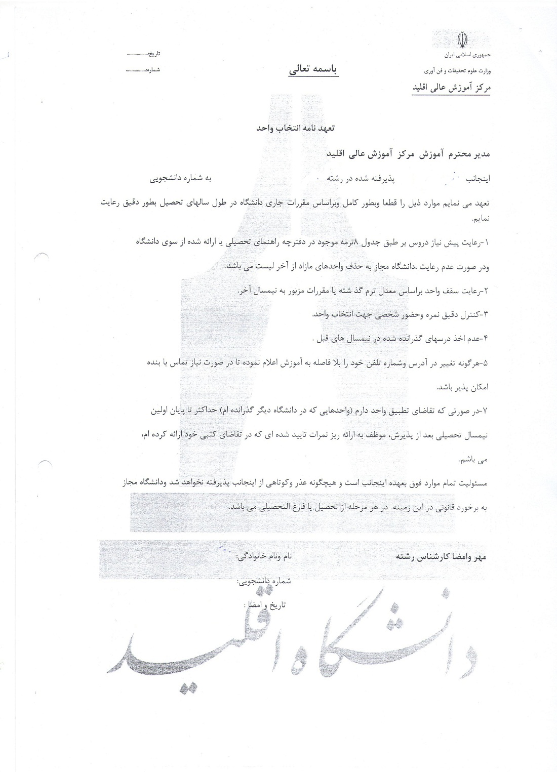 تعهدنامه انتخاب واحد