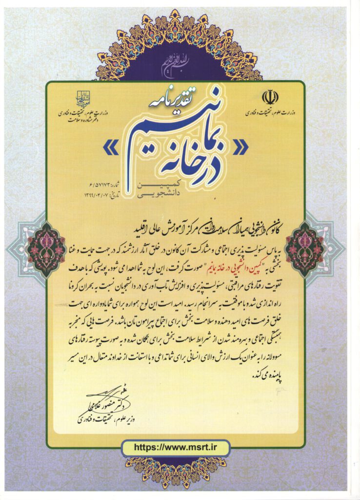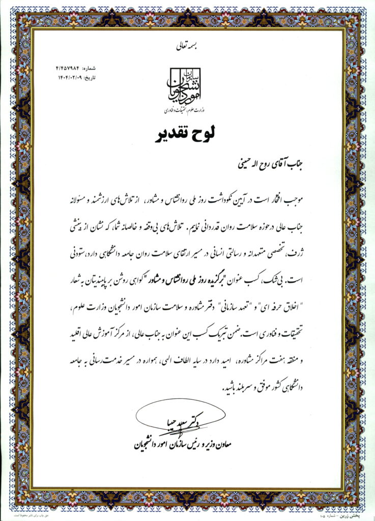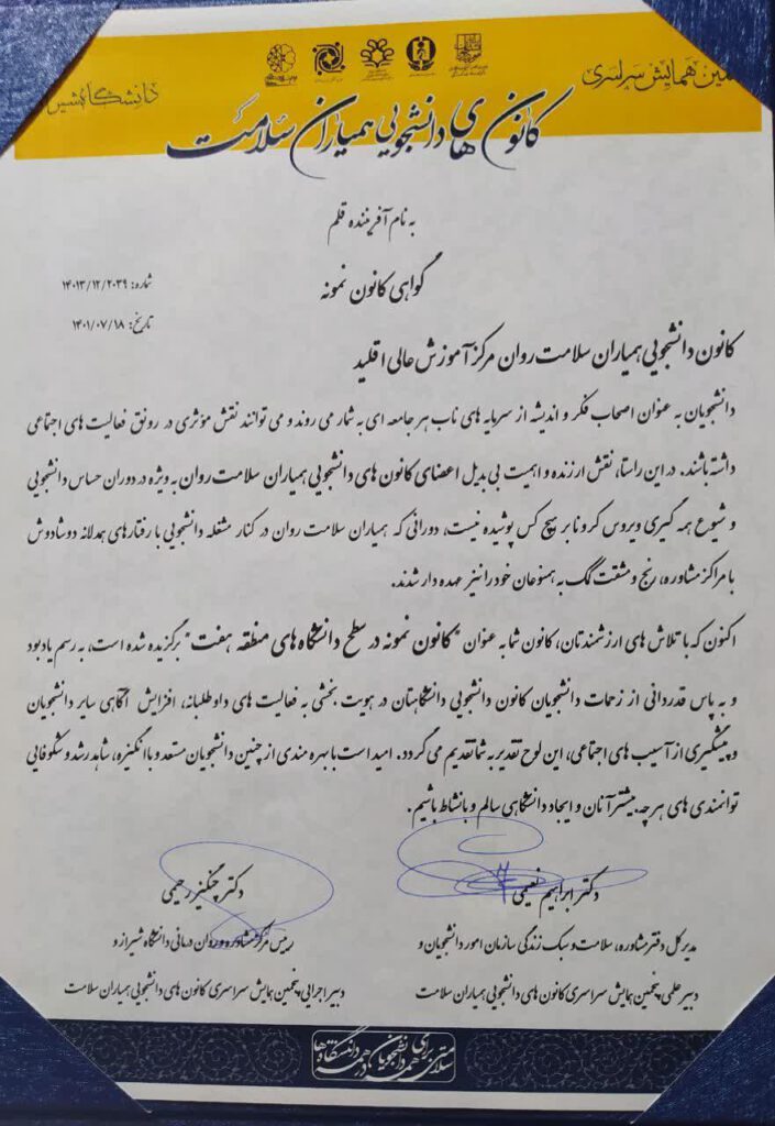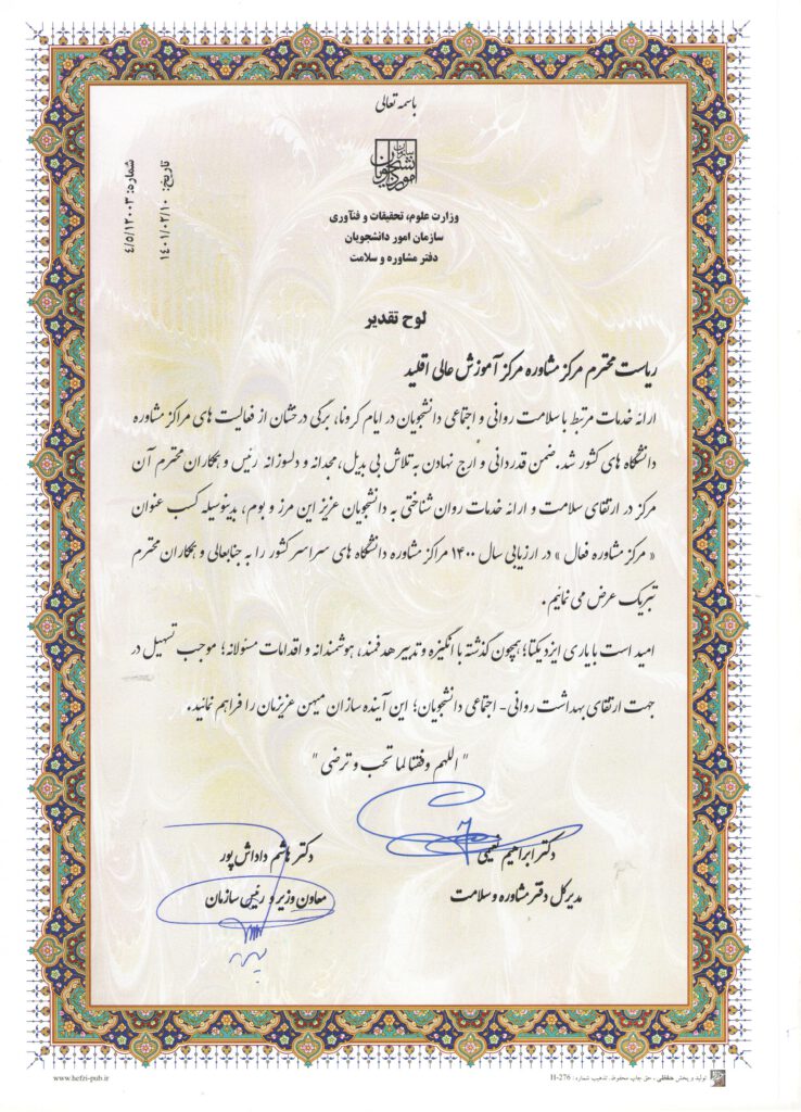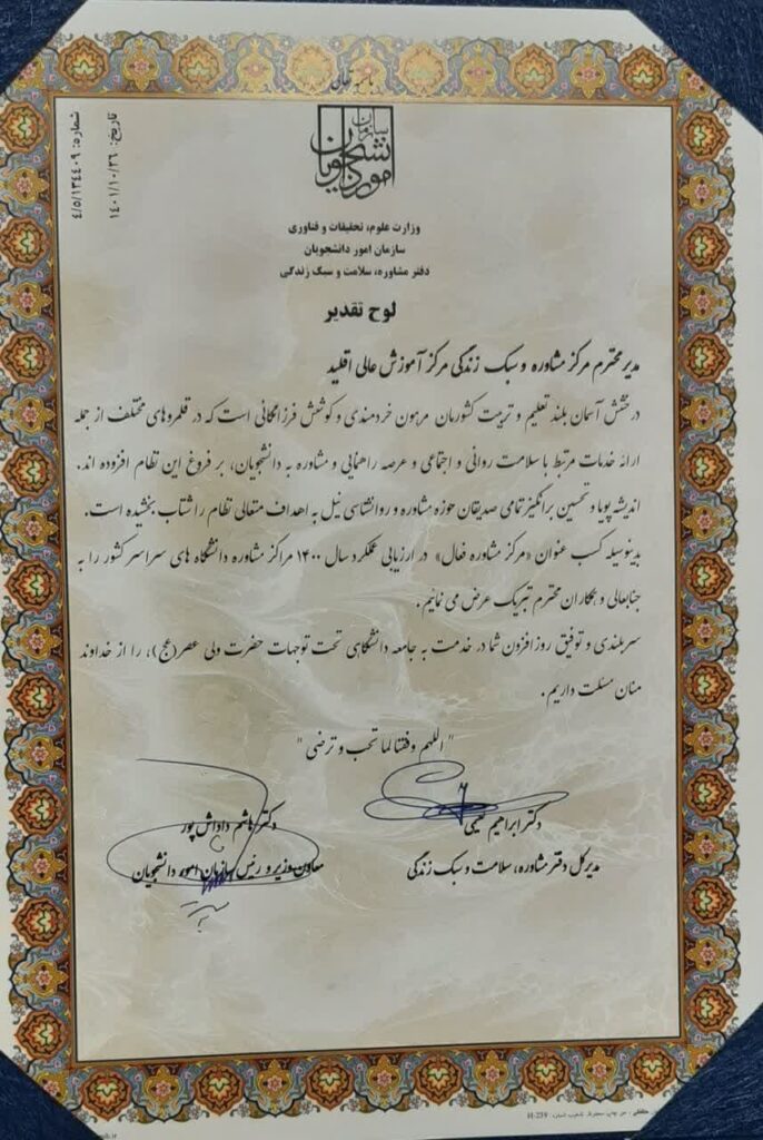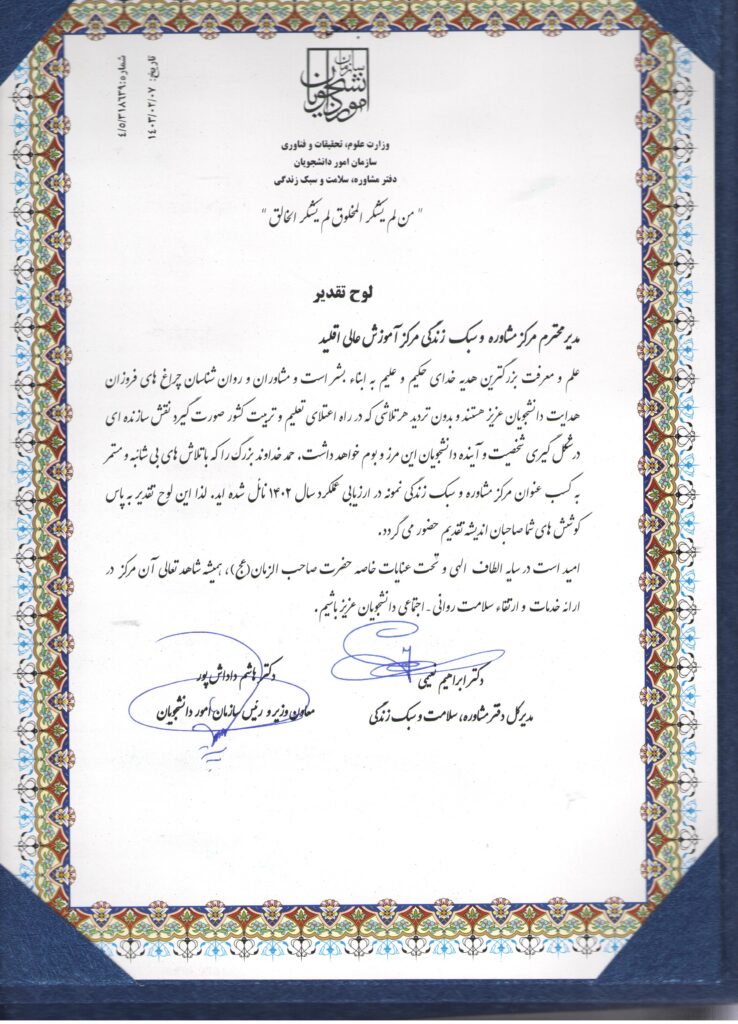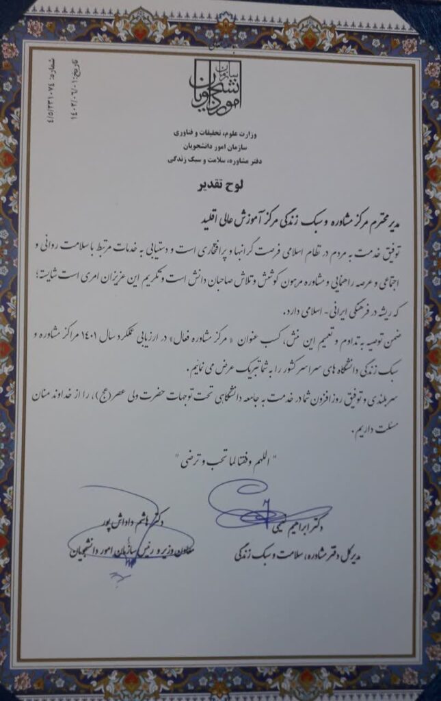 کسب رتبه نمونه کشوری توسط مرکز مشاوره و سبک زندگی مرکز آموزش عالی اقلید