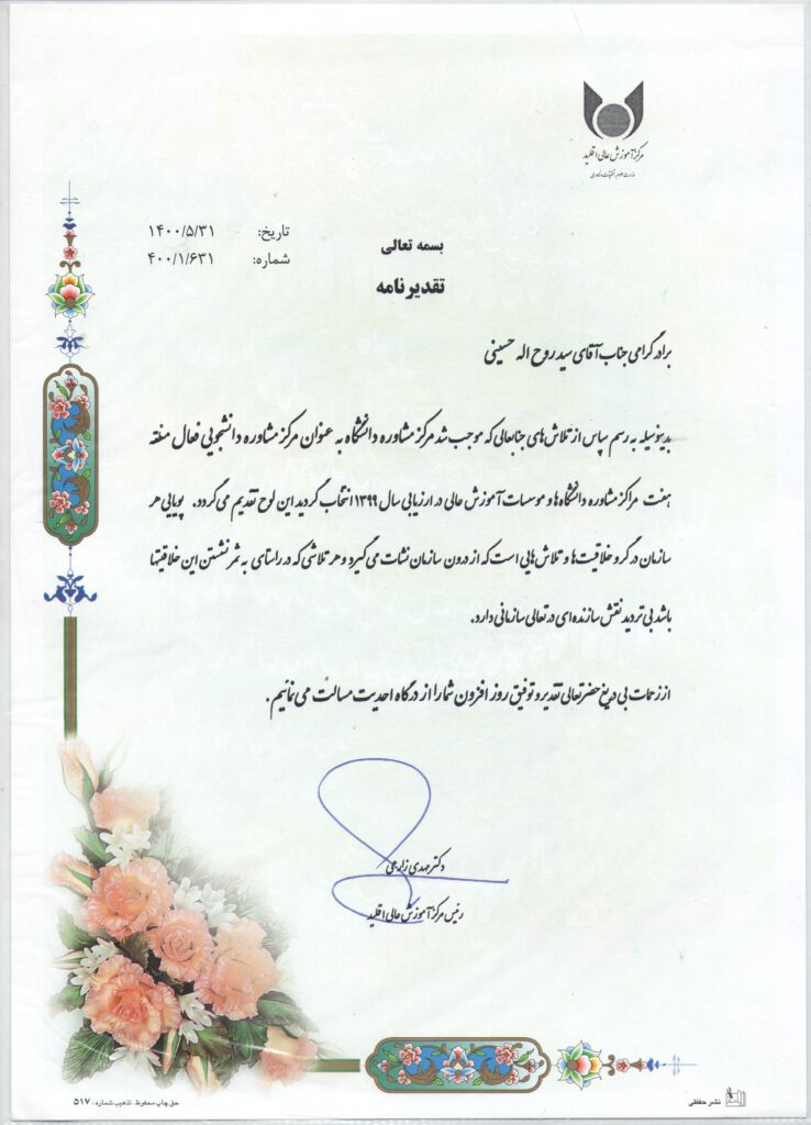 در سومین گردهمایی مدیران مراکز بهداشت و مدیران مراکز مشاوره و سبک زندگی دانشگاههای کشور به میزبانی دانشگاه سیستان و بلوچستان در تاریخ ۳ الی ۷ اردیبهشت ماه، مرکز مشاوره و سبک زندگی دانشگاه اقلید به عنوان مرکز نمونه در ارزیابی سال ۱۴۰۲ دانشگاه های کشور، معرفی و تقدیر شد. آقای سید روح الله حسینی…