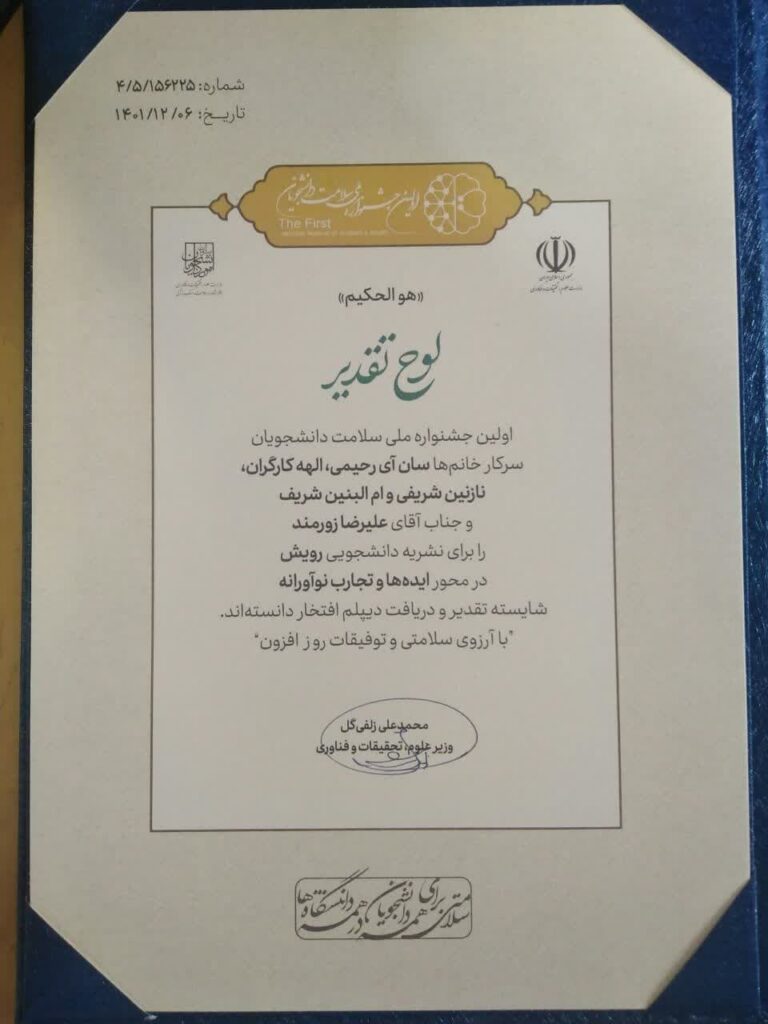 اعضای نشریه رویش در اولین جشنواره ملی سلامت دانشجویان، توسط وزیر محترم علوم تحقیقات و فناوری، تقدیر شدند. در روز دوشنبه مورخ ۸ اسفند ماه ۱۴۰۱ اولین جشنواره ملی سلامت دانشجویان به میزبانی دانشگاه تهران برگزار گردید. در این جشنواره که بیش از ۲۰۰۰ هزار اثر ارسال شده بود، از ۶۰ اثر برتر تقدیر گردید.…